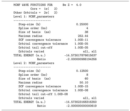 The B-spline methods clearly offer some advantages, even when they are more computationally intensive than finite difference methods. The eigenvalue method is the preferred method for singly occupied orbitals, particularly with large principal quantum numbers. However for a multiply occupied shell, the Newton–Raphson method is efficient in that the “self-energy” is readily accounted for which greatly improves the rate of convergence. When many subshells are present with different principal quantum numbers, convergence can be improved with the simultaneous improvement of orbitals. For this reason, both sphf [] and spmchf (available at GitHub []) have “phases” and different “levels” of accuracy. All iterative methods need initial estimates. The first phase is stable even when estimates are of a poor accuracy and the grid that defines the B-spline basis is relatively coarse. Orbitals are updated sequentially using the generalised eigenvalue method on the first iteration but, in other iterations use NR for a single orbital when a subshell is multiply occupied. This first phase is referred to as the “SCF” phase. The codes also have the initial level of accuracy (with a coarse grid) and less accurate tests for convergence and a higher level of accuracy. When initial estimates are for the refined grid, the program assumes there is only one level of accuracy. In any event, the convergence tests may be reset by the user, over-riding program defaults. Unlike the sphf program, the spmchf program does not include orbital rotation in this phase. The next phase is thought of as a “clean-up” phase that raises the level of accuracy and improves the relationship of one subshell to the other. In the Be case, if the orbital is too contracted the subshell will be too expanded. The NR phase deals with this issue that greatly affects the Virial Theorem (V/T) ratio, as well as orbital rotation when off-diagonal energy parameters are important.