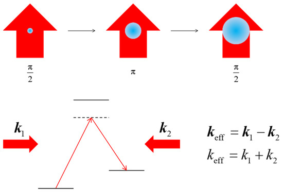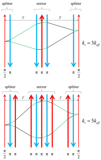 Techniques such as Bragg diffraction and Bloch oscillation in optical lattices require atoms with sub-recoil velocity spreads in the longitudinal direction, requiring either velocity selection or increased cooling, which adversely affect the signal to noise ratio as well as the repetition rate. As such, we focus here on the method of using additional Raman pulses [15,16,17]. The protocol for realizing LMT using this method is illustrated in Figure 7. Additional Raman pulses in alternating directions are added to the conventional pulse sequence.