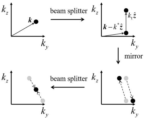 The evolution of a momentum eigenstate in the space in a PSI under rotation. A eigenstate is a single dot in the space. The first atomic beam splitter splits into a superposition of two eigenstates separated by the momentum transfer . The atomic mirror switches the position of the two eigenstates in the absence of rotation. In the presence of rotation, however, the two eigenstates will be shifted in the direction. The second beam splitter will combine the two eigenstates and make them interfere.
