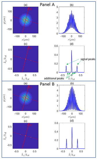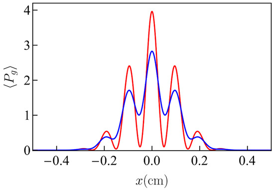 In Figure 5, we show a comparison between the signal of the PSI for two different values of a. For simplicity, we have considered here the case where the rotation is around the y-axis only, so that fringes occur only in the x-direction. For both curves, the temperature of the atoms was , and the half expansion time . The rotation rate wavenumber used was . The red curve shows the case where a = 0.002 cm, and the blue curve shows the case where a = 0.004 cm. We can see that with a smaller a, the contrast of the interference fringes was higher, as expected. In the simulation, we assumed that the sum in Equation (11) was truncated at a maximum occupation number, nmax, for the harmonic oscillator. This occupation number is dictated by the parameter . Specifically, the sum in Equation (11) was carried out from n = 0 to nmax = 4α and rounded to the nearest integer, which is sufficient to ensure that contributions from the excluded terms (i.e., for terms with n > 4α) were negligible. For the red curve, we had α = 7.2 and for the blue curve α = 28.9.