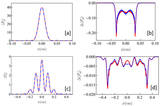 Next, we considered the PSI interaction. The fringes produced by the augmented quantum model (red) and the semi-classical model (dashed blue) are shown in Figure 6c. The parameters used here were , , α = 10, nmax = 40, and . Again, the plots are almost identical, and the difference is hard to infer from these plots. As such, in Figure 6d, we have shown in the blue curve the difference between the density distribution for the augmented quantum model and the semi-classical model for the plots shown in Figure 6c. In the red curve in Figure 6d, we have shown the corresponding difference when α = 20 and nmax = 80, with the value of and unchanged. Again, we see that the difference, while small, is real, and does not tend to vanish as the value of α is increased.