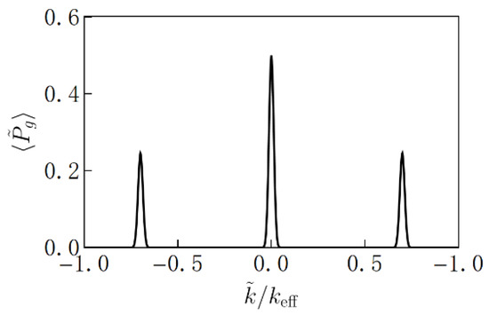 The D2 line decay rate from 52P3/2 to 52S1/2, expressed as , is about 2π × (6 MHz) for 87Rb. Only the atoms that have not experienced spontaneous emission keep their phase information. The fraction of atoms that have decohered by the end of the interferometry process is given by , where is the total duration of all the Raman pulses. With this model, we can simulate the signal for a PSI–LMT, while taking into account the complexities caused by detuning. The effect of spontaneous emission is considered later in a heuristic manner. In the model discussed in Section 3, we assumed all components to be resonant, which is approximately valid if the effective Rabi frequency is much larger than the Doppler shift. In order to account for more general conditions, in our simulation we used different Hamiltonian operators for different components, corresponding to Equation (16).