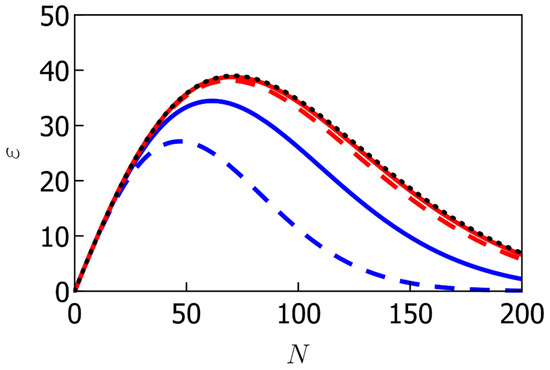 Relation between and given by Equation (31), with , , . The black dotted curve shows the case where , which is identical to the red curve in Figure 11 because in this case there is no effect of the finite initial size of the atomic cloud. The red curves are the plots for , while the blue curves are for . The solid (dashed) curves correspond to an angular velocity of 1(2) μHz. We can see that the larger the initial size is, the less LMT can improve the PSI.