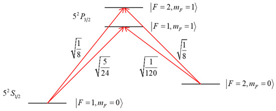 It can be seen from the discussion above that the value of is very important for the performance of the LMT-PSI. Therefore, we discuss here the relationship between the experimental parameters and . For , we assumed the ground state to be , and the excited state to be . In most implementations of Raman-pulse-based atom interferometers, the beams are circularly (σ) polarized [36]. If the beams are polarized, the intermediate state consists of two states: and of the manifold. The corresponding transition matrix elements [37] are shown in Figure 13. For the cycling transition from to , an intensity of 3.34 mW/cm2 yields . For a given intensity on each leg of the Raman transition, we can use this information to determine the effective Rabi frequency for each of the two Raman transitions, treated separately, and the net effective Rabi frequency would be the sum of these two effective Rabi frequencies. If we assume that each leg has the same laser intensity and consider the fact that the energy separation between the two upper levels (~157 MHz) is negligible compared to the detuning, then it is easy to see that the effective Rabi frequency for the lower Raman transition is weaker than that for the upper Raman transition by a factor of . If we consider the upper Raman transition only, the intensity needed for the condition of is ~3.7 W/cm2. When both Raman transitions are taken into account, an intensity lower by a factor of 3/4 (i.e., ~2.8 W/cm2) would produce the effective Rabi frequency corresponding to in our model presented above [38]. Such an intensity can be achieved, for example, by using a tapered amplifier on each leg of the Raman transition.