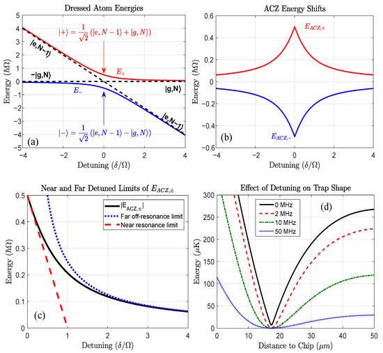 where the detuning is defined as . This dressed atom Hamiltonian can also be obtained by considering a two-level system interacting with an oscillating magnetic field and making the appropriate rotating frame transformation and rotating wave approximation [11]. The detuning has a moderating effect on the ACZ energy shift and trapping potential shape off-resonance, and it defines the degree of state mixing near resonance. We illustrate the role of detuning on trap shape in Figure 1d for a sample two-microstrip trap, explained later (see Section 5.1). Since the Rabi frequency broadens resonances, provides a good dimensionless parametric handle on the system.