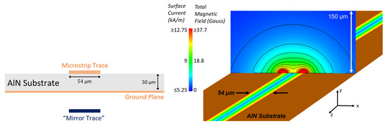 Single microstrip with 50 Ω impedance. (Left): Cross-sectional view of a single microstrip with 50 Ω impedance using a 50 μm thick aluminum nitride (AlN) substrate with relative permittivity . The microstrip trace has a thickness of 5 μm and a width of 54 μm. The microstrip maintains a 50 Ω impedance up to ∼20 GHz. Due to the ground plane, we can utilize image theory, in which a “mirror” trace carries equal but opposite current to the microstrip. (Right): FEKO simulation of the microstrip (left) showing the current and magnetic near field for 12.5 W at 6.8 GHz, corresponding to a microwave current of roughly 0.5 A. Due to the AC skin effect, the current density is largest along the edges of the trace. The microstrip was meshed to the width of the trace divided by 4 to show this effect.