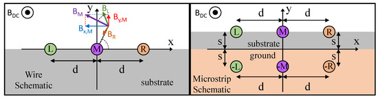 The calculations here are performed quasi-statically, where a current in the direction encodes its complex angle and its amplitude into the generated magnetic field vectors . The layout of the wire and microstrip configurations is given in Figure 3. The current I at generates magnetic field components at location given by and , where . These carry spatial scaling, the complex I’s phase, and vector orientation from and , where is the polar angle around the z-axis wire, starting from . We sum over active currents (replacing I at ) at horizontal distances d to the midline: left ( at ), middle ( at ), and right ( at ), all at for the “wire” cases. For microstrips, we add a ground plane at by moving the currents to , the substrate thickness, above the ground plane. To satisfy the boundary conditions at the ground plane, equal and opposite image currents are added at .