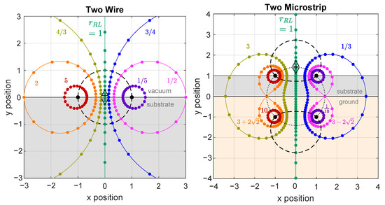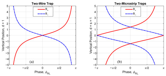 where the two ± signs on the right-hand side give four solutions and the left-hand side ± sign identifies the polarization. The four expressions are plotted in Figure 6 with the same formatting as Figure 4. The fields in Equation (14) still repeat when is advanced by , but similar to the two-microstrip and three-wire schemes, the phase must be advanced by multiples of for trapped atoms to return to their original locations. For different ranges of , it takes a , or advance in the phase to make a “total” cycle, depending on ’s magnitude, shown in Figure 6 (right). Crossovers between these regions of 4, 2, 1, 2, or 4 connected trap curves (shown by color or in Figure 6 (right)) are found to be simple expressions for , only for a simple case such as .