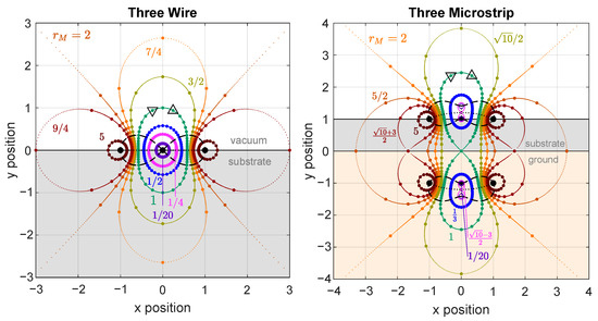 Trap minima locations in the three-wire (left) and three-microstrip (right) models for . Currents are marked by black dots. We plot various values of (labeled curves), across of phase given in 15° increments with large dots and milliradians in small dots. The black dashed figure-eight curve maps constant for a range of . Similarly, black dotted lines map . Locations of and traps at are marked with a △ and ▽, respectively.