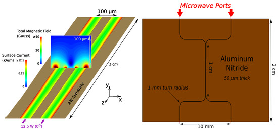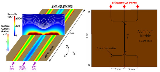 Simulation of the in-phase two-microstrip model. (Left): Current density and magnetic near field magnitude for the model (right) with 12.5 W of power in each trace at 6.8 GHz and zero relative phase. (Right): Geometry of the two-microstrip trap configuration. The 54 μm wide, 5 μm thick copper traces lie on a 2 × 2.5 cm, 50 μm thick AlN substrate. A 500 μm thick copper ground plane is placed below the substrate on the opposite side of the figure. A 1 mm turn radius is chosen to minimize the reflections. The traces are separated by 100 μm center-to-center in the trapping region of the chip. Microwaves are fed in through the microwave ports.