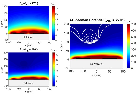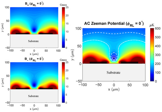 As outlined in Section 4.2, a benefit to using parallel microstrips is that the presence of the ground plane lifts the minimum of the combined magnetic field from the traces out of the plane of the chip. For currents in phase with one another, this results in co-located and traps. Using the model of Figure 7 (right), we direct 12.5 W into each input at 6.8 GHz with 50 Ω impedance and zero phase difference between the left and right ports. The resulting field components and corresponding ACZ potential for are shown in Figure 8. The substrate is shown in gray, and the black rectangles indicate the traces. Using Equation (5) for the magnetic hyperfine transition, we can convert the field into an ACZ potential. The conversion to μK uses , where is Boltzmann’s constant.