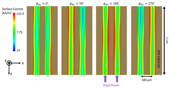 Simulation of the two-microstrip “double-s” model (Figure 7) at 6.8 GHz fed with 12.5 W at the inputs. The diagrams show the surface current magnitudes in the trapping region for different . When the input phase difference is 0° or 180°, the currents are symmetric about the center () and the proximity effect pushes the current in each trace towards the outer or inner edges of the microstrip, respectively. For other input phase differences (90° and 270° shown), we observe non-symmetric currents.