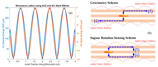 The three-microstrip trapping potential in Section 5.2 provides confinement in the -plane transverse to the microstrips but not longitudinally along the z-axis. A microwave lattice applied to the center microstrip at a frequency offset from the transverse trapping microwave fields provides axial confinement. As long as is much faster than the mechanical response of an atom (e.g., = 1 MHz versus = 0.1–1 kHz), the atoms only respond to the average microwave field magnitude at a given frequency, and thus, the total potential is just the sum of the lattice and transverse potentials.