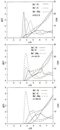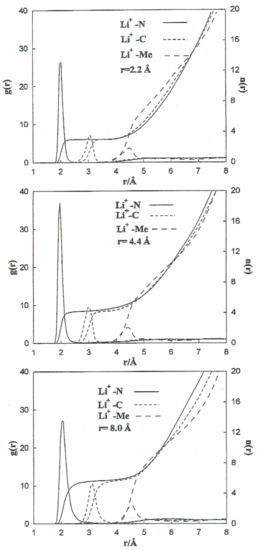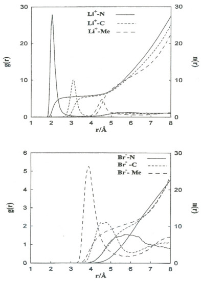To carry out a more quantitative analysis of the distribution of the liquid molecules around the ionic particles, we determined the radial ion–solvent distribution functions (left axis) and their corresponding coordination numbers (right axis) for different interionic separations. Figure 8 and Figure 9 show the radial distribution functions, Ion-Me, Ion-C and Ion-N, obtained in the situation of the Li+-Br− ion pair for the interionic separations corresponding to rCIP, rSIP and the maximum value of W(r). Table 7 summarizes the positions of the maximum and minimum radial distribution functions for the various cases analyzed. The corresponding coordination numbers are given in Table 8. A coordination number () of 23 for a free bromide ion in acetonitrile is large. This value may be attributed to the deficiency in the interaction potentials used. Nevertheless, other studies indicate that the solvation shell of the Br-anion can have a maximum number of molecules of acetonitrile bigger than 10 [9]. It should also be pointed out that in aqueous solutions coordination numbers increase when the concentration decrease [26].