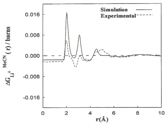 Elastic neutron scattering measurements obtained by applying the first-order difference approach [22,23] yield experimental information about the arrangement of solvent molecules surrounding ions. This procedure establishes a difference function , which is a combination of the partial radial distribution functions corresponding to each solvent atom: , , . The experimental solubility of LiBr in acetonitrile is 0.58 M. We calculated the corresponding to this concentration from the for Li+ as follows: