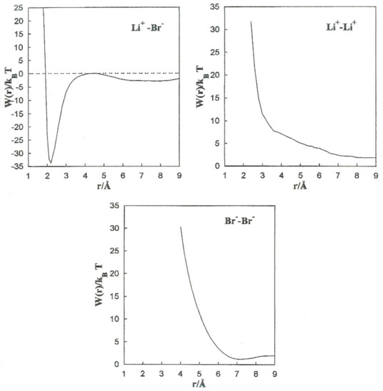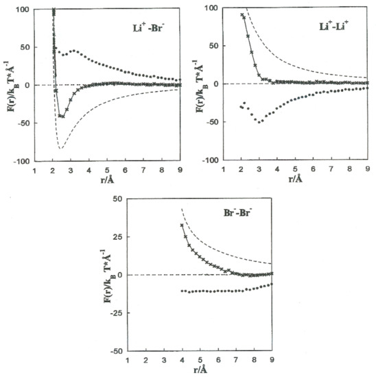 This is constant with the trend of polar liquids to produce stable complexes in the case of like-ion pairs, and to separate ions with opposite signs [2,3,4,5]. Equilibrium between the direct and solvent contributions results in a repulsive force acting on the Li+-Li+ pair at all distances. For the Li+-Br− pair, the resultant force is repulsive at extremely small distances and attractive at middle separation. The total force on the Br−-Br− pair has similar tendencies, but the attractive component is considerably less significant.