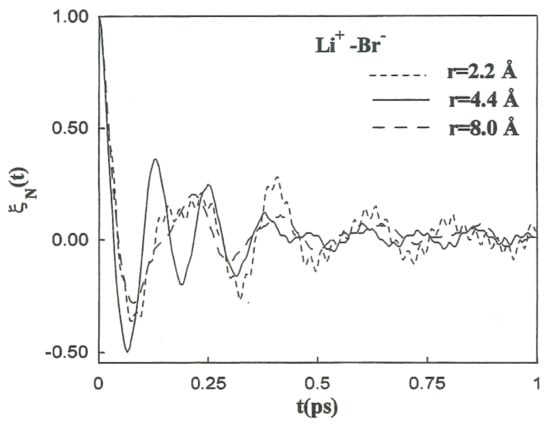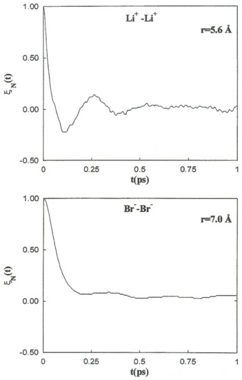 It is follows that is the characteristic frequency for the unstable motion at the transition state. For the coefficients involved in the previous theory regarding the Li+-Br−, Li+-Li+, and Br−-Br− systems, the initial values of the friction kernels ( are summarized in Table 9. The initial time values of the kernels are not only dependent on the ionic species but also show noticeable changes with the interionic separation. This interionic separation dependence of is strongly related to the magnitude of the changes in the solvent structure around the ion pairs as a function of these separations. The normalized friction kernels () related through all cases are displayed in Figure 10 and Figure 11. There are features common to the functions of both systems, all of which show a rapid and very similar initial decay before 0.2 ps. A lengthy decay follows, characterized for each individual system.