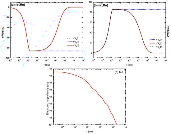 It is worth mentioning that, due to the presence of the exchange and the absorption part in optical potential, there are some dependence on the collision energy, and the potentials shown in Figure 1 are calculated for 1 keV. The nuclear radius of radon is ≃ a.u. At a.u., the nuclear potential accounts for the finite nuclear size and is derived from the Fermi charge distribution. As in Figure 1a, the electronic potential coincides with the Coulomb field in the region a.u., i.e., outside the nucleus, but well inside the K-shell. The respective potentials for positron scattering are shown in Figure 1b. Due to opposite charge of the projectile the optical potential for positron scattering has basically a sign reversal as compared to the electronic potential.