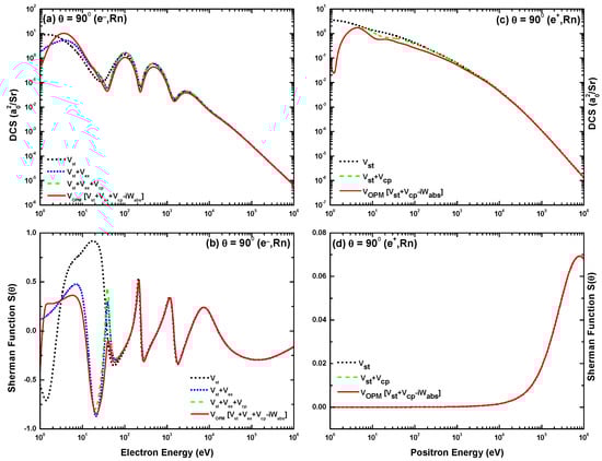 Figure 2 demonstrates the sensitivity of different constituents of the real part of used in the present study to predict DCS and both for electrons and positrons scattering from Rn atoms. For a sample case the energy dependence of the DCS and of the are given at the scattering angle , proceeding from to by successively including and . It is evident from this figure that the static potential is the dominant contributor to both DCS and over the entire energy range. The remaining components (i.e., the exchange , the polarization and the absorption ) have very small contribution except at lower energies. For electron impact scattering, in Figure 2a,b, the inclusion of the leads to a considerable modification of the structures both in DCS and . Furthermore, this influence of remains important up to 100 eV for the DCS and 50 eV for the . Due to the absence of , the DCS and for positron scattering, in Figure 2c,d, show monotonous behavior. This behavior indicates that the atomic electrons just screen the nuclear field in the case of positron impact, while they act as individual scattering centers for electron scattering.