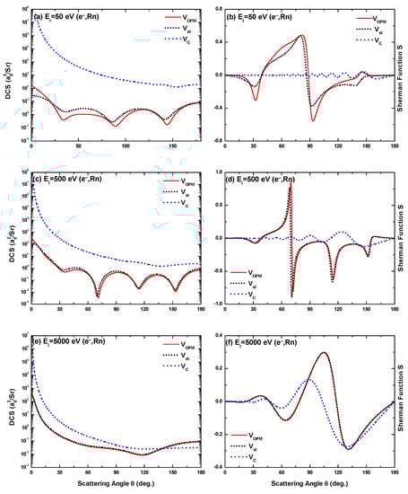 In Figure 3, we present DCS and Sherman function for 50–5000 eV electrons impact on Rn to demonstrate the effect of different contributions to the . One can notice, from Figure 3a at 50 eV, a significant difference between the DCS results from and , particularly in the forward hemisphere. This is due to the greater influence of the other potential constituents on the cross section at lower energies than so at higher energies. The absorption potential remains important at energies up to about 500 eV, decreasing the DCS by up to a factor of 2. Even at 5 keV, its influence is still visible. Comparison is also made with the result for a pure Coulomb field , for which the DCS diverges at zero angle. It is seen that the results gradually approach the Coulombic behavior with increasing energy. This happens due to the deeper penetration of the projectile at higher energies and thereby making the effect of the screening of the nucleus by the surrounding electrons lesser and lesser.