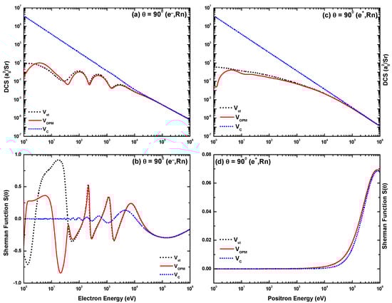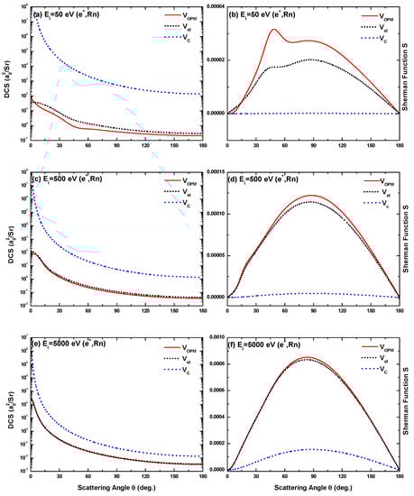 Figure 5 displays energy dependence of the DCS and the Sherman function for e-Rn scattering comparing the predictions of the and with those of the Coulomb field . For electron impact scattering, as seen in Figure 5a, the differences between the DCS results predicted by and those by gradually decrease with increasing energy, and almost vanish at energies beyond 10 keV. In the case of , in Figure 5b, the oscillatory behavior induced by these two potentials gradually matches with increasing incident energies. Same features are observed for the positron impact scattering as evident in Figure 5c,d. However, the differences between the DCS results predicted by these two potentials persist in more higher energies (50 keV) indicating that the influence of the absorption potential is even stronger than for electrons.