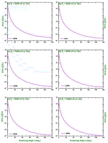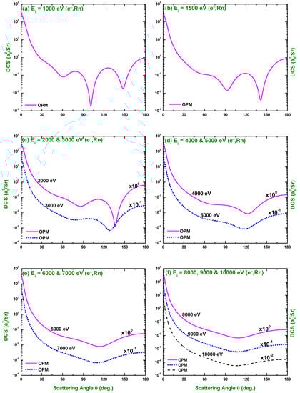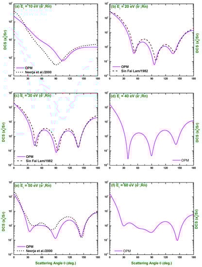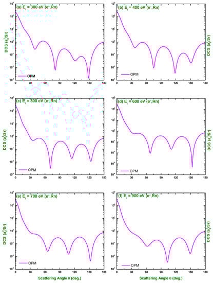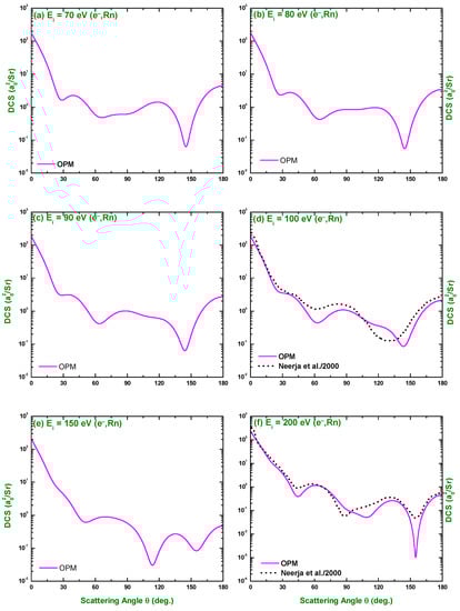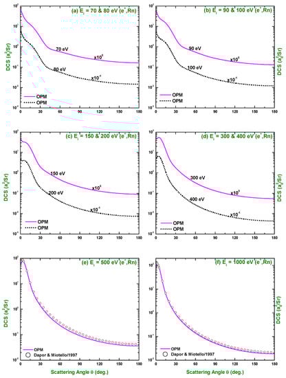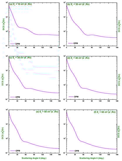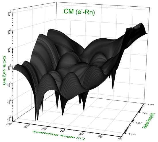 The DCS for electrons elastically scattered from neutral radon calculated using our modified Coulomb potential over a wide range of energies 10 eV 10 keV are presented in Figure 6, Figure 7, Figure 8 and Figure 9. As seen in these figures, the number of minima in the present DCS distributions varies with energy from 1 at eV to 3 at eV and to 4 at 700 eV. The DCS again reveals 3 minima at 1000 eV and 2 at 5000 eV. With a further increase in the collision energy to 6000 eV, the number of minima reduces to 1. These minima in the cross sections, the so-called Ramsauer–Townsend (R-T) structures [39], are due to diffraction effects arising from the quantum-mechanical nature of matter. The R-T structures disappear when the collision becomes so energetic that the lepton-atom interactions occur inside the K-shell. These structures are, therefore, of great interest to study collision dynamics.