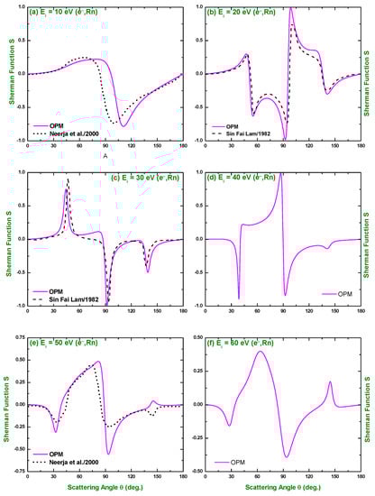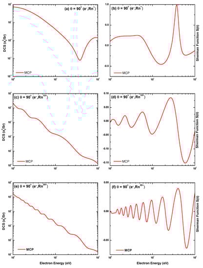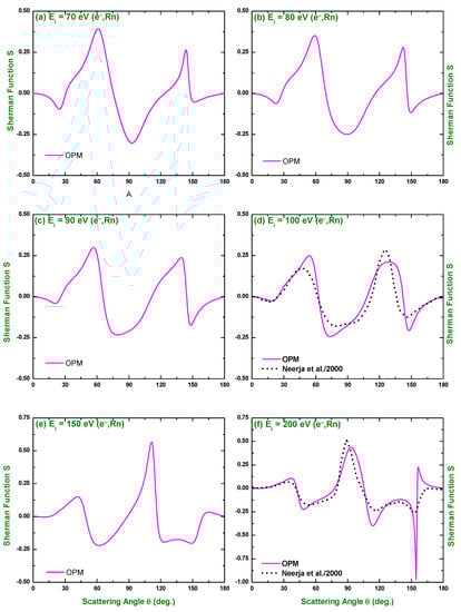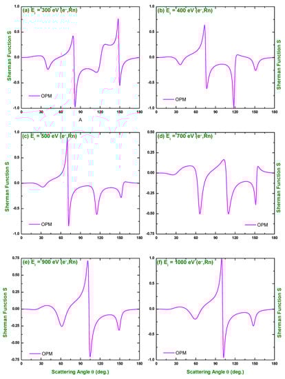 In Figure 10, Figure 11 and Figure 12, we present our MCP results of the Sherman function S for e-Rn scattering at incident energies eV. One can see in these figures that the minima in are strongly related to the minima in the DCS distributions. However, the structures in are much more pronounced than those in the DCS. This is expected because the spin asymmetry is more sensitive to the choice of potentials and methods of calculations. It is also evident that, at low energies ( 100 eV), the magnitudes of are higher at forward scattering angles than at backward angles. This is due to the effect of the exchange potential that deepens the minima, but is less important at backward angles. In contrast, at higher energies (≥150 eV), the magnitude of gets larger with increasing scattering angle. This is the effect of the stronger nuclear field on the spin polarization at the smaller projectile-nucleus distance.
