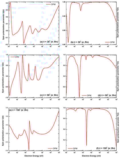 Energy dependence of the spin polarization parameters U and T for positrons elastically scattered from neutral radon atoms are depicted in Figure 24 at and . It is observed in this figure that, as expected, the variation of U and T with energy are opposite to each other. Starting from zero, the magnitude of increases very slowly up to = 10 keV, and beyond that it increases rapidly and reaches its maximum value. The maximum value of is obtained at . Below and beyond this scattering angle, the values decrease. The parameter T, on the other hand, starts at its maximum and slowly decreases with energies. Beyond = 10 keV, the values of sharply fall to its minimum, which is the lowest at . We are not aware of any experimental or any other theoretical studies regarding these parameter for e− Rn scattering. We expect that the present study will encourage both experimental and theoretical groups to pay their attention to this scattering system.