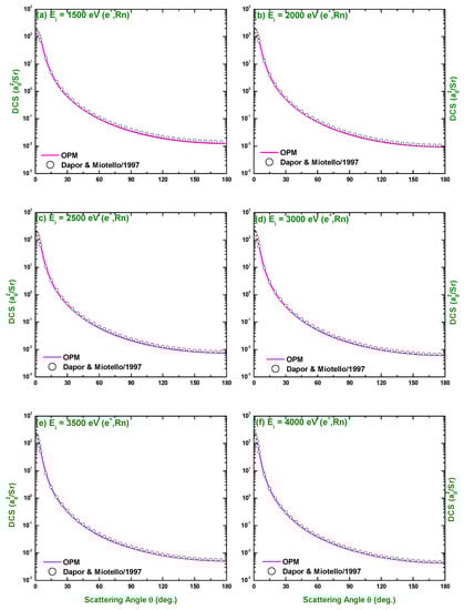 We have not found any experimental measurements for positron impact on radon targets. The present DCS results for positron impact scattering are, therefore, compared with the only calculations of Dapor and Miotello [21] available for = 500–4000 eV. The comparison shows that the two calculations agree very well with each other except a slight differences in magnitude at 500 eV for higher scattering angles.