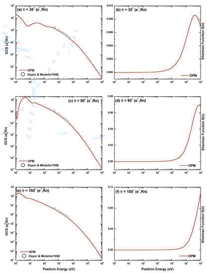 In Figure 23, we display energy dependence of the DCS and of the corresponding Sherman function for positron scattering from neutral radon atoms at three scattering angles and 150. As seen in this figure, minor structures appear in the DCS distributions at lower scattering angles, and they fade with the increase of energy. The present DCSs are again compared with those of Dapor and Miotello [21]. Similar to the case of electron scattering, the Sherman function increases with increasing scattering angles. However, the positron spin polarization is considerably smaller than that of its electron counterpart. This might be due to the Coulomb-dominated behavior of the positron potential [42].