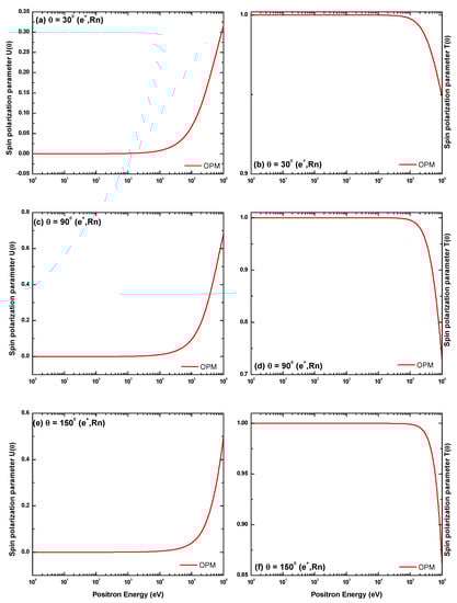 Energy dependence of the spin polarization parameters U and T for positrons elastically scattered from neutral radon atoms at scattering angles (a,b): 30, (c,d): 90 and (e,f): 150.