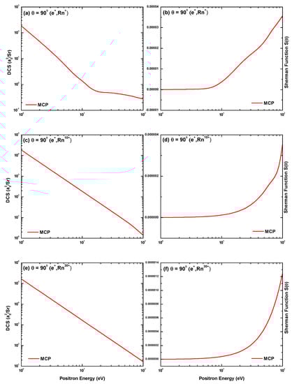 Energy dependent DCS and corresponding Sherman function for positrons elastically scattered from (a,b): Rn, (c,d): Rn and (e,f): Rn at fixed scattering angle .