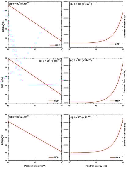 Energy dependence of the DCS and the Sherman function for positrons elastically scattered from neutral radon atoms at scattering angles (a,b): 30, (c,d): 90 and (e,f): 150.