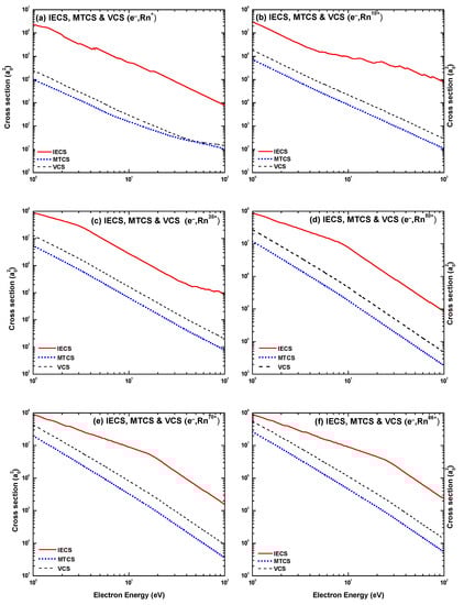 Energy dependence of the IECS, MTCS and VCS for the elastic scattering of electrons from (a) Rn, (b) Rn, (c) Rn, (d) Rn, (e) Rn and (f) Rn.