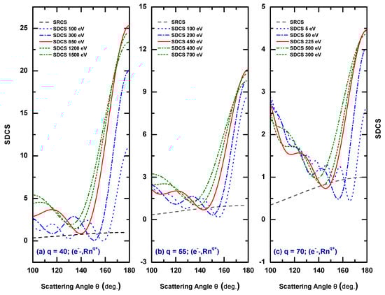 Figure 30 displays the energy variation of the IECS, MTCS and VCS of electrons elastically scattered from different charge states of radon ions. As seen in this figure, for ions with lower q (), the IECS increases with increasing the charge. This is expected because of the screening effect of the surrounding electron cloud. The interaction potential energy of the projectile electron with bound electron cloud is opposite in sign to that of the nucleus charge. Furthermore, the screening effect of the surrounding electron cloud is, therefore, strong for the ions of lower charge. The cross section increases as the increase of q diminishes the screening effect. It is also evident that, for (), the IECS is almost independent of q and varies in conformity with the Rutherford scattering formula corresponding to the nuclear charge Z. For ions with higher q, the cross section is almost solely determined by the nuclear charge of the ion. From Figure 28, one can see the similar trend in the energy dependent MTCS and VCS with the ion charge q.