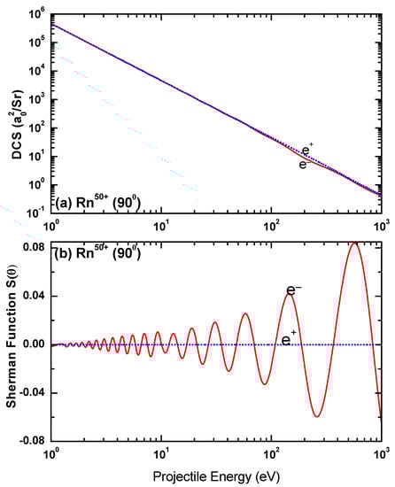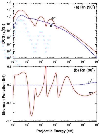 In Figure 32, we compare the energy dependent DCS and the corresponding Sherman function results at 90 for the scattering of electrons and positrons from neutral radon atoms. The basic features of the DCS in the energy region above some tens of eV up to a few keV are oscillations originated due to the diffraction of the projectile beam by the atomic target electrons. The structures disappear when the collision becomes energetic enough so that the beam has passed even the innermost K-shell electrons before the scattering events take place. As seen in Figure 32a, for electron impact scattering, three DCS minima appear within = 30 eV to 3 keV, and beyond that the DCS decreases monotonously with increasing energy. For positron impact scattering, on the other hand, the number of DCS minima reduces to 2 and confined to low energies: the first minimum is at 2 eV and the second one at 20 eV. The reduced number of DCS minima for positron projectile is due to the absence of exchange potential, and low energy structure is the influence of the correlation polarization potential. One can also see from Figure 32a that the values of positron DCS at all energies are smaller than those of electron DCS. This feature supports the fact that the target electrons do not serve as scattering centers for the positrons. Instead, they screen the central field, thereby lowering the DCS as compared to its electron counterpart.