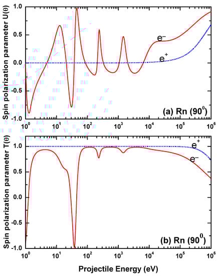 In Figure 33, we compare our spin polarization parameters U and T results, respectively, in Figure 33a,b, between electron and positron impact scatterings at fixed angle . It is revealed that, for electron scattering, multiple structures appear in both U and T up to several hundred keV. However, the structures are more stronger at lower energy and become less pronounced with increasing energy. For positron scattering, on the other hand, no structures are observed in U and T. Starting from zero the U parameter increases very slowly with energy up to 300 keV and then increases rapidly. The same feature is also observed in the case of T parameter but with opposite sign.