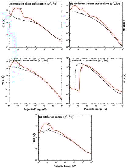 For e-Rn scattering, the present results of IECS, MTCS, VCS, INCS and TCS calculated for 1 eV 1 MeV are presented in Figure 25. It is noticeable that all these results are considerably different in values and shape from their electron counterparts. The magnitude of these cross sections is two to three times smaller than those due to electron scattering. Regarding the shape, on the other hand, some structures are clearly visible in IECS, MTCS and VCS curves for electron scattering, whereas they are very shallow in the case of positron scattering. These variations certainly support the fact that the e-Rn interaction is rather weaker as compared to its electron counterpart. It is worth mentioning that the interaction potentials involved in these two projectiles are drastically different. In the case of positron projectile, the static potential () is repulsive and the exchange potential () is absent as opposed to the electron projectile. Moreover, the polarization potential of the short range parts also different for both the projectiles.