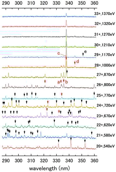 Emission line spectra for 290–360 nm measured at 14 electron beam energies for 540–1370 eV are shown in Figure 2. The present measurements are performed at electron beam energies such that each ionization threshold of consecutive charge states for 20–33 falls in between the successive energies. In the present wavelength range, 64 lines in total are identified as emission lines of W–W ions. Quite a few emission lines are observed in the spectra especially for lower charge states () reflecting complicated atomic structures of the ground state configurations with many electrons. The lines a and b are due to the M1 transitions of W in the ground state: and , respectively [23]. The line c is the M1 transition of W in the ground state: [25]. The line d is the M1 transition of W in the excited state: [27].