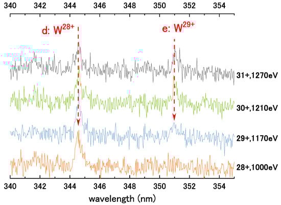 Figure 3 shows spectra magnified for the line e of W at 351.03(10) nm along with the line d of W. The line e is absent in the spectrum of 1000 eV below the ionization threshold of W (1132 eV [36]). Line e appears from the spectrum of 1170 eV and increases the intensity at higher energies, while the intensity of the line d decreases monotonically with the energy.