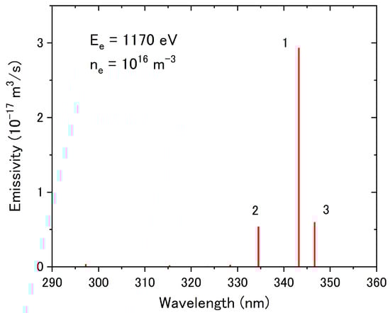 Emission line spectrum of the CR model for W. The transition of the line 1 is , the line 2 , and the line 3 .