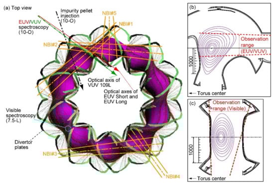 LHD is a heliotron-type plasma confinement device which has the major/minor radii of 3.6/0.64 m in the standard configuration with a maximum plasma volume of 30 m3 and toroidal magnetic field of 3 T [23]. The coil system consists of a set of two continuous superconducting helical coils with a poloidal pitch number of two and a toroidal pitch number of 10 and three pairs of superconducting poloidal coils. Figure 1a illustrates the top view of the shape of the plasma in the LHD device together with schematic drawings of the neutral beam injection (NBI) for heating, the impurity pellet injection, and the spectroscopic diagnostics consisting of two flat-field grazing incidence EUV spectrometers (denoted as “EUV Short” [24] and “EUV Long” [25]), a normal incidence 20 cm VUV spectrometer (denoted as “VUV 109L” [26]), and an astigmatism-corrected Czerny–Turner-type 30 cm visible spectrometer (denoted as “MK300” [27]). Neutral hydrogen atoms are used as beam particles in the experiments presented in this paper. NBIs #1, 2, and 3, which have negative ion sources (n-NBI), are injected tangentially to the magnetic axis, while #4 and 5 with positive ion sources (p-NBI) are injected perpendicular to the magnetic axis. Tungsten ions are distributed in the NBI-heated LHD plasma by injecting a pellet consisting of a small piece of tungsten metal wire enclosed by a carbon or polyethylene pellet with the shape of a cylindrical tube [13]. Figure 1b,c illustrate the cross sections of the magnetic surfaces, where the optical axes of the VUV/EUV and visible spectroscopy systems are located, respectively, together with the field of view of each system. The EUV Short, EUV Long, and VUV 109L spectrometers cover the wavelength ranges of 5–60 Å, 100–300 Å, and 250–1050 Å, respectively. CCD detectors (1024 × 256 pixels, pixel size 26 × 26 μm2, Andor DO420-BN) are placed at the positions of the exit slits of the spectrometers. A CCD data acquisition operational mode applied in this experiment is called “full-binning” mode, in which all CCD-pixels aligned in the vertical direction are replaced by a single channel, and the vertical spatial resolution is entirely eliminated. The time resolution for the spectra measurements is 5 ms in the full-binning data acquisition mode. The MK300 visible spectrometer covers the wavelength range of 3200–3550 Å. A CCD detector (1024 × 1024 pixels, pixel size 13 × 13 μm2, Andor DU934-N) is placed at the position of the exit slit of the spectrometer and is operated in the sub-image data acquisition mode with a sampling time of 100 ms, including an exposure time of 61.55 ms. Although this spectrometer usually divides the field of view into 40 observation chords to measure the spatial distribution of the emission [28], in this paper we used the spectra obtained by integrating all 40 observation chords.
