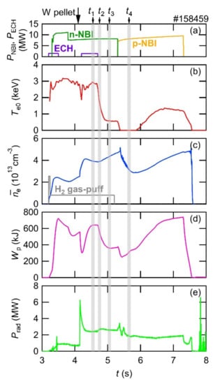 Figure 2 shows a typical waveform of the tungsten pellet injection experiment in a hydrogen discharge with the position of the magnetic axis, Rax, at 3.6 m at a toroidal magnetic field, Bt, of 2.75 T in the counter-clockwise direction. In this discharge, the length and diameter of a tungsten wire enclosed in a carbon pellet were 0.7 mm and 0.1 mm, respectively. Then, the number of tungsten atoms enclosed in a pellet, NW, was 3.5 × 1017. As shown in Figure 2a, the plasma was initiated by electron cyclotron heating (ECH), and further heated by the neutral hydrogen beams. Figure 2b–e show the central electron temperature, Te0, the line-averaged electron density, , the plasma stored energy, Wp, and the total radiation power, Prad, respectively. In order to obtain Te0, the electron temperature measured by Thomson scattering at the location of −0.1 < reff/a99 < 0.1 was averaged, where reff is the effective minor radius and a99 is the plasma edge, defined as the effective minor radius in which 99% of electron stored energy was enclosed [29]. After the tungsten pellet injection at 4.1 s, Te0 and Wp quickly decreased, while ne increased. ECH was superposed for 4.2–4.7 s; then, Te0 recovered up to around 3 keV. After the ECH was turned off, Te0 decreased and kept the value around 0.6 keV for 5.0–5.3 s. The NBI heating scheme was switched from the n-NBIs to p-NBIs at 5.3 s. Then, Te0 decreased down to a very low level close to zero for 5.4–5.9 s, followed by a recovery to a value of around 1.4 keV due to continuous heating by p-NBIs. In this paper, spectral data were obtained at four different timings with different Te0, namely t1 = 4.5 s (Te0 ~ 3.0 keV), t2 = 4.7 s (Te0 ~ 1.7 keV), t3 = 5.0 s (Te0 ~ 0.6 keV), and t4 = 5.6 s (Te0 ~ 0 keV), as indicated in Figure 2, to demonstrate the effect of the electron temperature on the observable charge states of the tungsten ions.