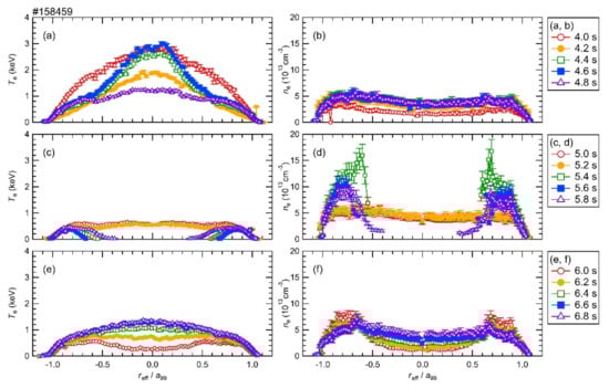 Temporal evolutions of radial profiles of electron temperature, Te, and electron density, ne, (a,b) for 4.0–4.8 s, (c,d) for 5.0–5.8 s, and (e,f) for 6.0–6.8 s plotted against effective minor radius, reff, normalized by a99. Locations of reff/a99 = ±1 are plasma edges.