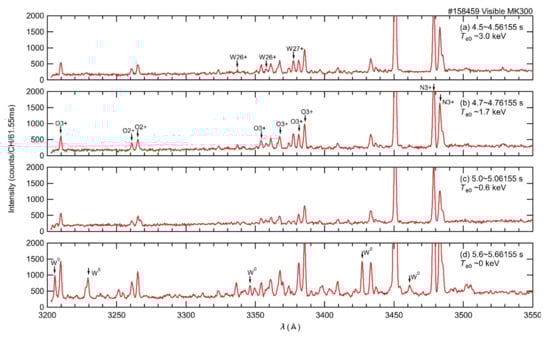 The results of the spectroscopic observations are summarized in this section. The identifications of charge states and the transitions are taken from the NIST database [30]. Figure 4 shows visible spectra including W0, W26+, and W27+ line emissions in the wavelength range of 3200–3550 Å measured using the MK300 spectrometer. Te0 is also indicated for each timing of the data acquisition. W26+ 3337.05 Å (4d104f2 3F, J = 4 → 4d104f2 3F, J = 3), W26+ 3357.61 Å (4d104f2 3F, J = 4 → 4d104f2 1G, J = 4), and W27+ 3377.42 Å (4d104f 2F°, J = 7/2 → 4d104f 2F°, J = 5/2) were observed in the spectra with Te0 = 3.0 keV and 1.7 keV, as shown in Figure 4a,b, respectively. These W26+ and W27+ lines have already been identified as the M1 forbidden transition lines [16,17]. These lines became less significant in the spectrum with Te0 = 0.6 keV as shown in Figure 4c, and completely disappeared in the spectrum with Te0 = 0 keV as shown in Figure 4d. On the other hand, Figure 4d indicated that several W0 lines appeared at the wavelengths of 3205.54 Å, 3229.26 Å, 3346.19 Å, 3427.03 Å, and 3461.26 Å in the spectrum with Te0 = 0 keV [30].