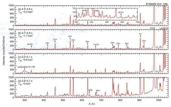 Figure 5 shows VUV spectra, including W5+, W37+, and W38+ line emissions in the wavelength range of 250–1050 Å, measured using the VUV 109L spectrometer with Te0 for each timing of the data acquisition. W37+ 646.3 Å (4p64d 2D, J = 5/2 → 4p64d 2D, J = 3/2), W38+ 532.2 Å (4p54d (3/2, 5/2)°, J = 3 → 4p54d (3/2, 3/2)°, J = 3), and W38+ 559.3 Å (4p54d (3/2, 5/2)°, J = 3 → 4p54d (3/2, 3/2)°, J = 2) were observed in the spectrum with Te0 = 3.0 keV as shown in Figure 5a [19]. These W37+ and W38+ lines have been already identified as the M1 forbidden transition lines. These lines completely disappeared in the spectrum with Te0 = 1.7 keV, as shown in Figure 5b. In the spectrum with Te0 = 0.6 keV, a UTA-like broad peak was observed around 300 Å, as shown in Figure 5c. Identification of the charge states and the transitions of this UTA will be a subject of future studies. In the spectrum with Te0 = 0 keV, two clear peaks of W5+ emission with 6p → 5d transition were observed at 639.62 Å and 677.34 Å, as shown in Figure 5d [18,26,30].