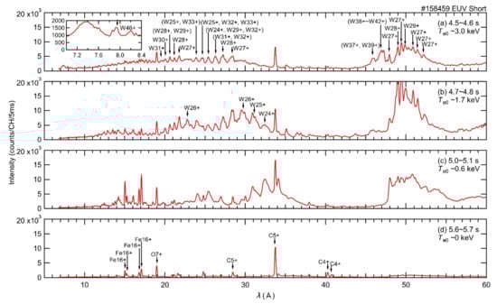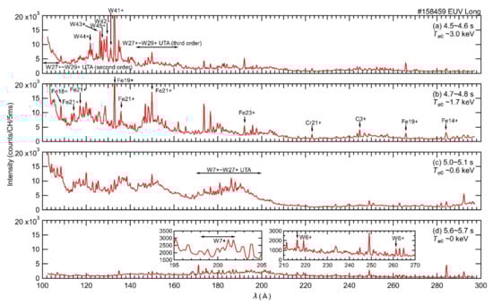 Figure 7 shows the EUV spectra, including W24+–W42+ UTA and W46+ line emissions in the wavelength range of 5–60 Å, measured using the EUV Short spectrometer with Te0 for each timing of the data acquisition. A W46+ emission line was observed at 7.93 Å as the highest charge state of tungsten ions in LHD in the spectrum with Te0 = 3.0 keV, as shown in Figure 7a [22]. This line is a blend of an E2 transition of W46+ at 7.928 Å (3d94s (5/2, 1/2), J = 2 → 3d10 1S, J = 0) and a magnetic-octupole (M3) transition of W46+ at 7.938 Å (3d94s (5/2, 1/2), J = 3 → 3d10 1S, J = 0). UTAs consisting of W24+–W33+ and W27+–W42+ also appeared at 19–33 Å and 46–53 Å, respectively. The identification of charge states of the UTA was performed by comparing the spectra obtained in LHD and the compact electron beam ion trap (CoBIT) with CR model calculations [11,37,38,39]. It is worth noting that the UTAs at around 50 Å have been used to evaluate tungsten ion concentrations in tokamak experiments [40]. More detailed discussion on determination of the tungsten ion density in LHD has also been provided using W24+, W25+, and W26+ peaks in the UTA [41]. The spectral shape of the UTAs depended on Te0 in such a way that the spectral structure of W37+–W42+ at 46–48 Å disappeared in the spectrum with Te0 = 1.7 keV as shown in Figure 7b, and W24+ at 32.5 Å became prominent in the spectrum with Te0 = 0.6 keV as shown in Figure 7c. Finally, no emission lines of W ions can be seen in the spectrum with Te0 = 0 keV as shown in Figure 7d.