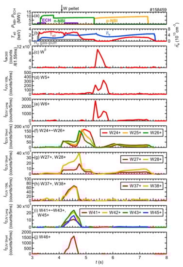 As an example of an application of the summarized wavelengths, the temporal variation of emission of each charge state during the discharge is demonstrated. Figure 8 shows the temporal evolution of: Figure 8a, the heating power of ECH, n-NBI, and p-NBI, Figure 8b, the central electron temperature and line-averaged electron density, W0–W46+ intensities integrated over the wavelength ranges of Figure 8c, 3426.2–3427.9 Å for W0, Figure 8d 637.8–641.2 Å for W5+, Figure 8e 261.0–261.5 Å for W6+, Figure 8f 32.15–32.30 Å for W24+, 30.73–31.69 Å for W25+, 29.29–30.40 Å for W26+, Figure 8g 28.58–28.69 Å for W27+, 27.35–27.78 Å for W28+, Figure 8h 645.3–647.1 Å for W37+, 558.6–560.3 Å for W38+, Figure 8i 131.0–131.3 Å for W41+, 129.2–129.5 Å for W42+, 126.1–126.5 Å for W43+, 126.9–127.3 Å for W45+, and Figure 8j 7.89–7.95 Å for W46+. The vertical axes in Figure 8c–j show the number of counts detected by the CCD, and the corresponding spectrometer is indicated by subscripts such as “IMK300”, “IVUV 109L”, “IEUV Long”, and “IEUV Short”. The signal levels in neighboring wavelength ranges with no significant line emissions were subtracted from the tungsten line intensities as background levels mainly consisting of bremsstrahlung emissions.