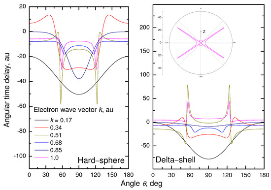 Figure 1 shows the results of the calculation by formula (9) of the angular time delay as a function of the scattering angle for some fixed electron momenta k. The left panel corresponds to the scattering on the solid sphere. The right panel corresponds to the delta-shell target. The angular time delays in these figures are given in atomic units. The atomic unit of time is equal to 24.2 attoseconds. Despite the different scales of the graphs on both panels, they show qualitatively similar behavior. The only exceptions are for the curves at . The graph of the angular dependence for the hard-sphere is almost a straight line passing from a positive to a negative half-plane at the angle of about 60, whereas on the right panel, this curve almost coincides with the x-axis. According to both panels, at low electron energies ( and 0.34), the time delay of the scattering packet is negative at all the scattering angles. The rest of the curves (except the hard-sphere target at ) are alternating for both targets. At the momenta and , the time delays on the right panel reach its maximum (∼298 atomic units (au) at in the first case and ∼140 au at the same angle in the second one). The appearance of these sharp peaks in the curves in Figure 1 is due to the almost vanishing of the denominator in the expression (9). The curves at and on the left panel cross the x-axis into the positive half-plane in the region of 90, forming a peak with a height of ~30 atomic units.