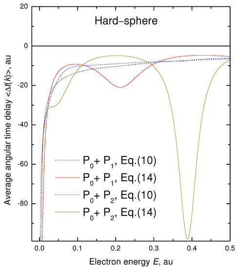 The second term on the left-hand side of Equation (14) eliminates the contribution of the forward scattering into the average angular time delay. Thus, the average time delay for the plane wave train is a linear combination of the EWS time delays (3). The results of the calculation of the function (14) in the case of electrons scattered by the hard-sphere target are shown in Figure 4.